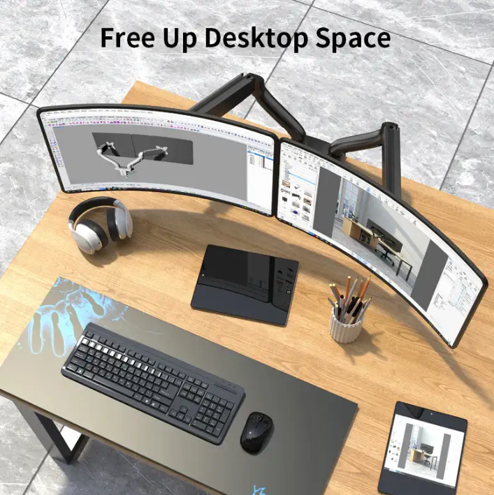 A monitor arm helps position your screen at eye level, reducing neck and shoulder strain. It also frees up desk space and improves flexibility.